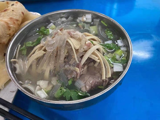 午餐時間到了。一碗牛肉湯甚是美味,西瓜清涼解渴。